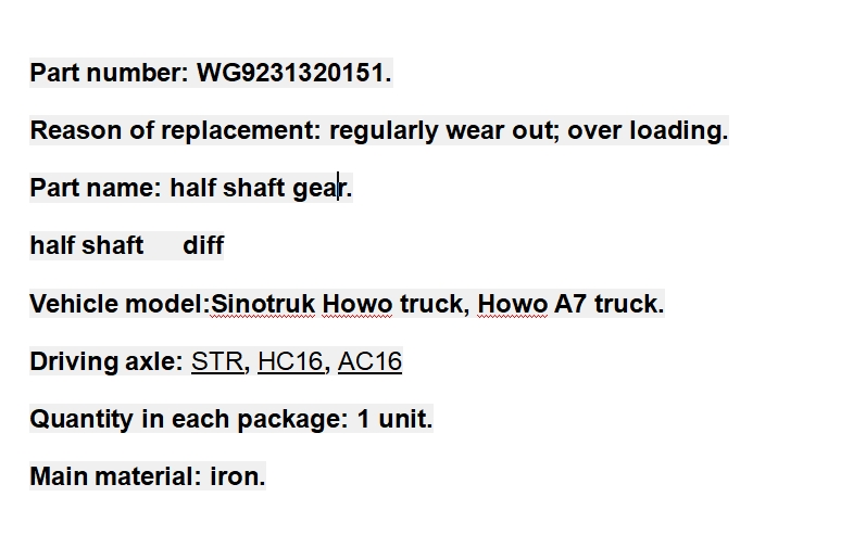 WG9231320151 half shaft gear